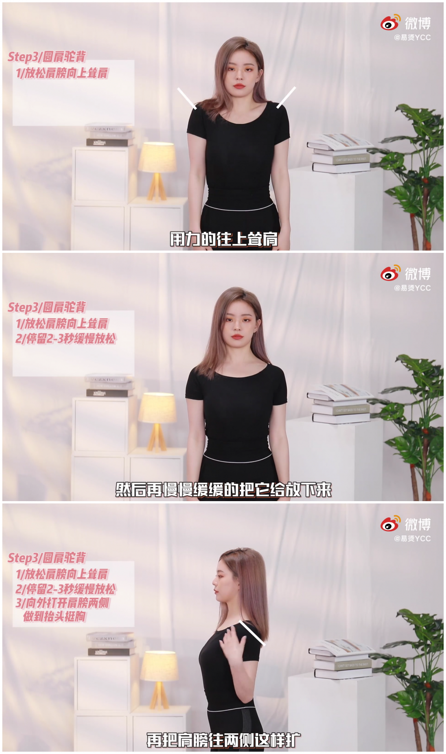 放松肩膀向上耸肩,停留2-3秒缓慢放松,再将肩膀向两侧阔开,像打开一扇门,把肩膀打开,做到抬头挺胸。