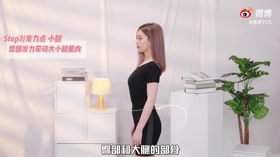 内手肘向外翻转平行朝前,内手肘紧靠腰部,打造上宽下窄的线条感。手肘朝外贴合腰线摆动,甩手时前面只是微微带过,尽量往后给力。