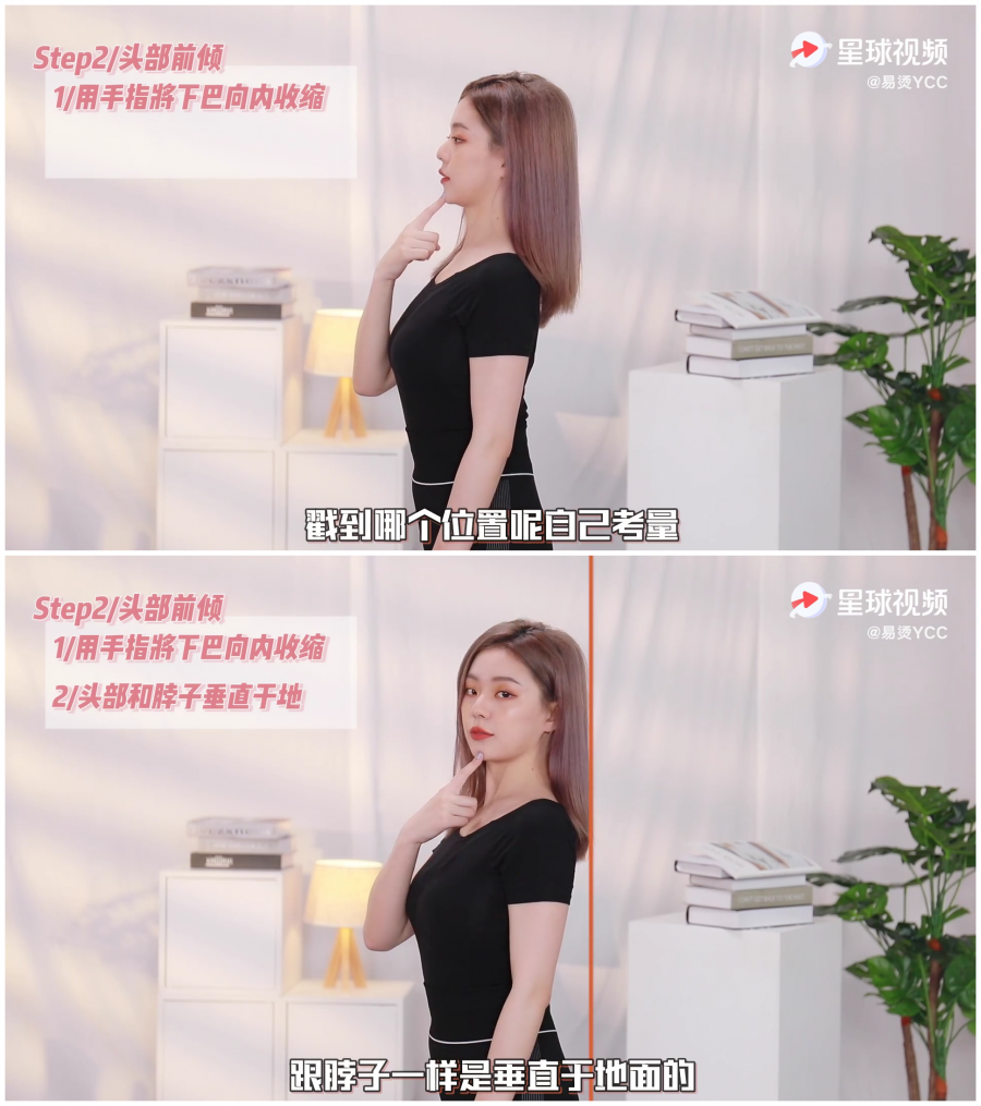 用手指将下巴向内收缩,头部和脖子垂直于地面。