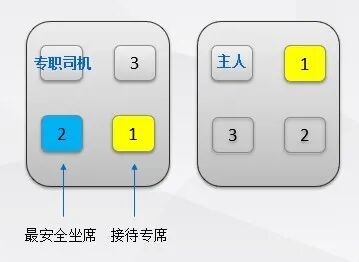 商务场合:专职司机,后排右座为上(根据国内交通规则而定),副驾驶座为随员座;VIP上座(安保上座),为司机后面那个座位,安全系数最高,副驾驶座为末座。