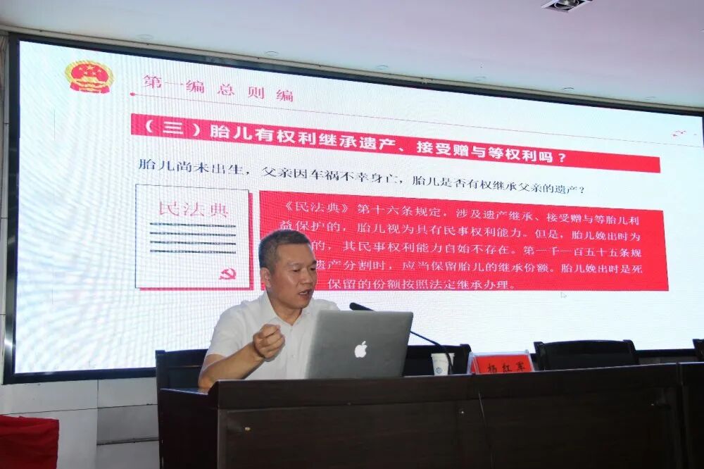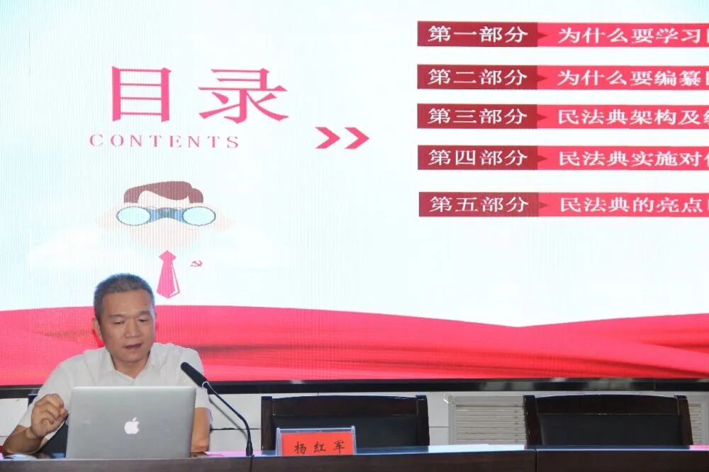杨红军副主任将整场报告会分为五个部分,分别为“为什么要学习民法典”、“为什么要编纂民法典”、“民法典架构及编纂历程”、“民法典实施对依法行政的影响”、“民法典的亮点以及对生活的影响”。